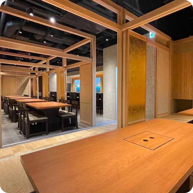 個室テーブルや座敷席などの内装に温かみと安らぎのある落ち着いた雰囲気。周囲を気にせず大切な会話をしたい時にも最適です。お部屋の広さはさまざまで、デートやご接待、記念日のお祝いなどにご利用いただけます。大切なご接待に相応しいプライベート空間。良質なお肉やお酒を味わいながら、特別なひとときをお過ごしください。