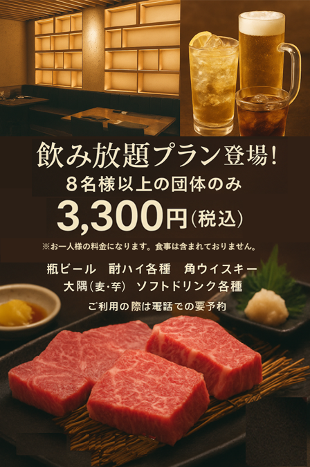 8名様以上の団体様限定。お一人様3,300円(税込)にて、ご利用いただけます。